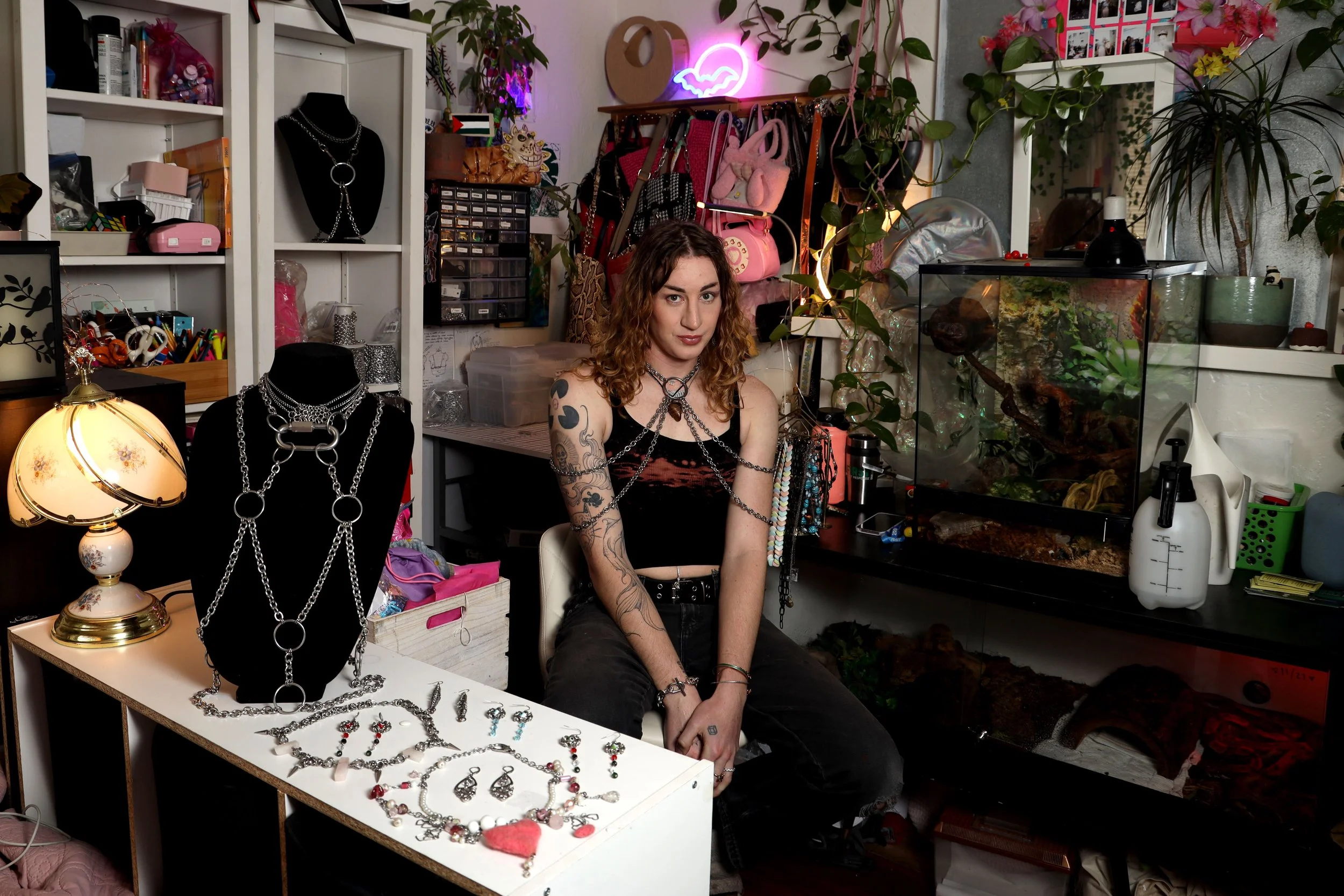June Nelson is an Oakland-based artist and designer who primarily makes clothes and jewelry, but loves exploring all kinds of different art mediums. She was born and raised in Denver and studied cognitive science and education at UC Berkeley. Loving the community and possibilities in the Bay Area, June has remained in Oakland since she graduated in 2020. She continues to draw and make various forms of wearable art based on her experiences and political beliefs, like upcycling used clothes into brand-new garments and repurposing vintage jewelry into something wearable. June believes that all forms of art, including traditionally prestigious forms like high fashion, should be accessible to everyone, and she works to share her artistic knowledge and materials with the world.